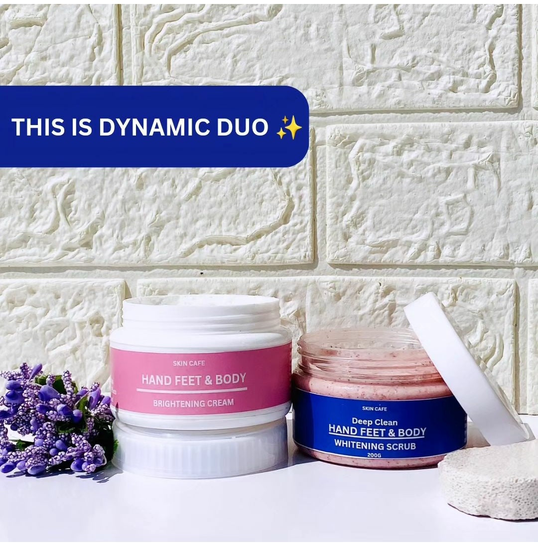 Organic Hands & Feet Brightening Cream penetrates deep into the skin to fight skin damage. The cream is packed with the natural goodness proven to lighten and brighten feet tone. & Deep clean Hand feet Whitening scrub will exfoliates the outermost layer of pore-clogging dead skin. The unique formula of scrub will wave good-bye to dead skin as well as smooth and brighten your complexion without irritation The all-natural formula is suitable for all skin types.